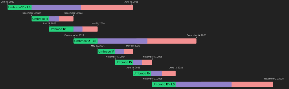 Umbraco 17 är en LTS-version (Long Term Support). Det innebär att den kommer stödjas i tre år med uppdateringar. Den släpps den 27 november 2025 och har support ända till november 2028.
